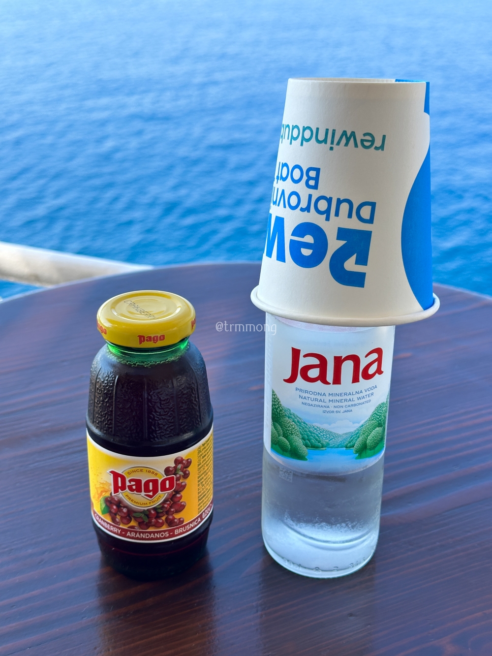 우리가 주문한 생수 한 병과 과일 주스 하나.