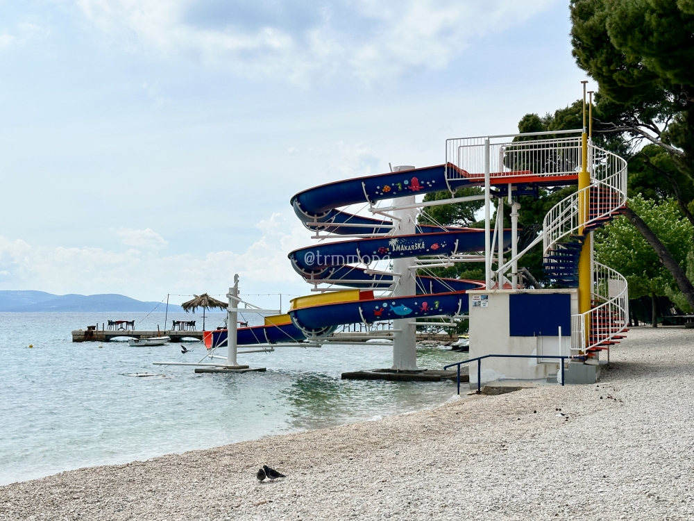 바다로 바로 이어지는 워터 슬라이드가 있었다. 아직은 한산하지만 한창 바다 수영을 즐기는 시즌에는 해변에서 가장 핫한 장소일 것이다. 꺅꺅 소리 지르며 바다로 풍덩풍덩 뛰어드는 재미에 폭 빠진 아이들의 모습이 눈에 훤하다. 유럽 사람들은 어른 아이 할 것 없이 다이빙 홀릭이기 때문이다.