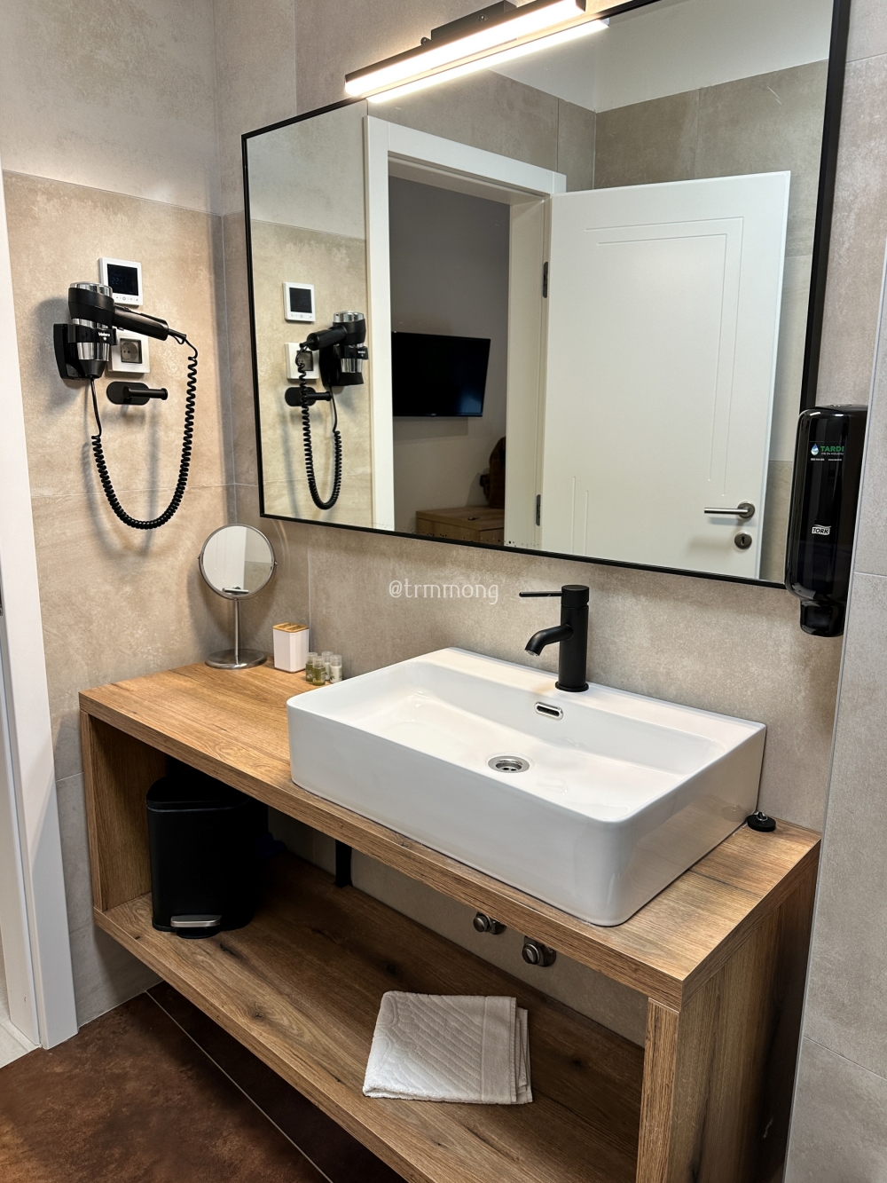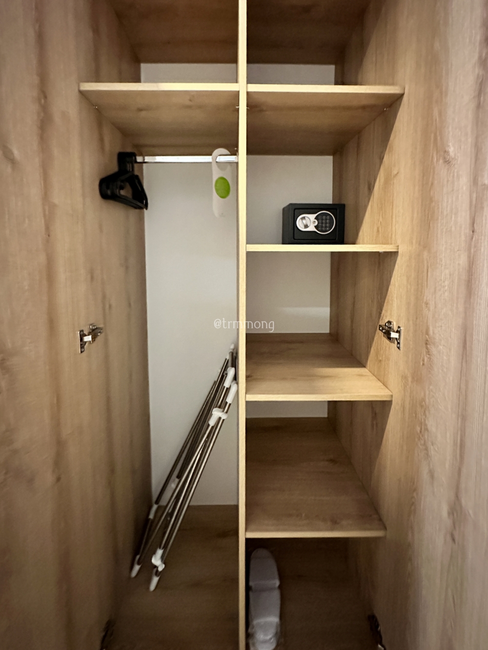 대신 수납공간이 실하게 잘 되어있었다. 옷장 문이 전신 거울로 되어 있다는 점이 좋았다. 안에는 옷걸이, 안전 금고, 실내용 슬리퍼, 빨래 건조대가 들어 있었다. 우리는 이곳에서 1박만 할 예정이었기 때문에 이 정도 수납장이면 충분했다.