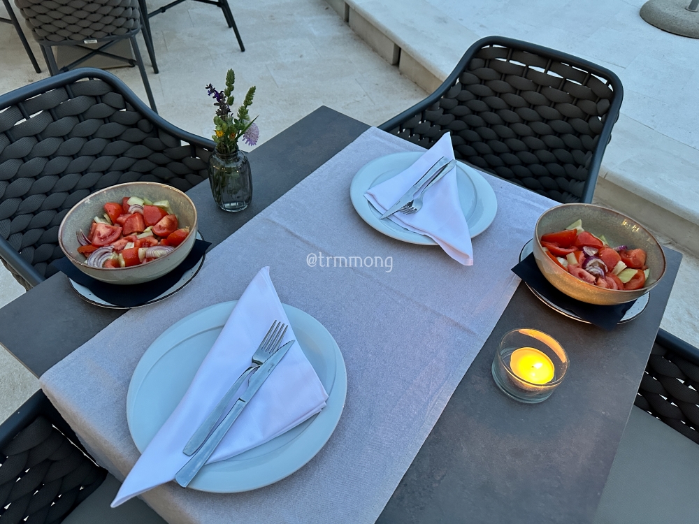 야외에 차려진 디너 테이블. 놀랍게도 다이닝 테이블이 딱 하나만 세팅되어 있었다. 레스토랑은 아직 오픈 준비 단계여서 지금은 사전에 예약받은 팀만 준비해 주고 있다고 했다. 그래도 우리밖에 없을 줄은 몰랐다.