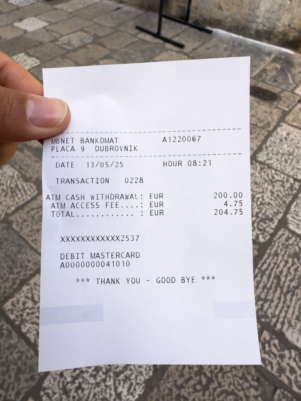 나는 자그레바치카 은행(Zagrebačka banka) ATM을 이용했다. 200유로를 인출하고 수수료로 4.75유로가 부과됐다.