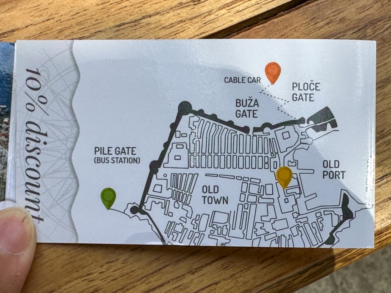 계산을 마치니, 프로모션 카드 하나를 줬다. 두브로브니크 내에 다른 레스토랑도 함께 운영하고 있는 것 같았다. 이 카드를 가지고 방문하면 세 곳의 레스토랑에서 식사 비용의 10%를 할인받을 수 있다. 덕분에 우리는 이 다음날 점심을 먹었던 그라드스카 카바나 아스날(Gradska kavana Arsenal)에서도 큰 금액을 아낄 수 있었다.