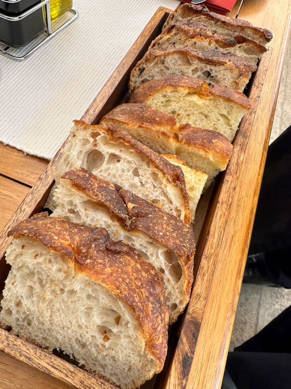 곧 식전 빵을 준비해 줬다. 나무 상자에 세 종류의 빵이 담겨져 나오는데, 갓 구운 빵처럼 신선해서 겉은 바삭하고 속은 촉촉해서 아주 맛있었다. 참고로 이 식전 빵은 유료다. 주문하지 않아도 제공되고 가져다줄 때 유료라는 부분을 별도로 설명해 주지 않는다. 그런데 영수증에는 포함되어서 나온다. 우리 부부는 유료라도 맛있으면 OK 다!